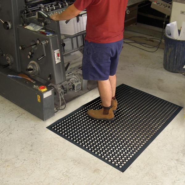 Our multi purpose mat is an economical mat for wet and dry work areas. It’s 12mm soft rubber design gives high comfort levels, while the perforations offer superior drainage in wet areas. This mat is ideal for kitchens, restaurants, bars and industrial work stations. The black mat is constructed from 100% natural rubber making it grease and chemical resistant, whilst the terracotta mat includes a nitrile composition making it more suitable for oily, greasy conditions.